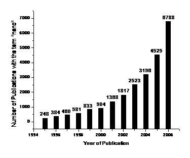 publications with the term nano from 1995- 2006 with the number for 2006 extrapolated from the results